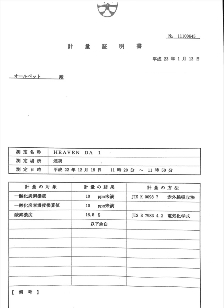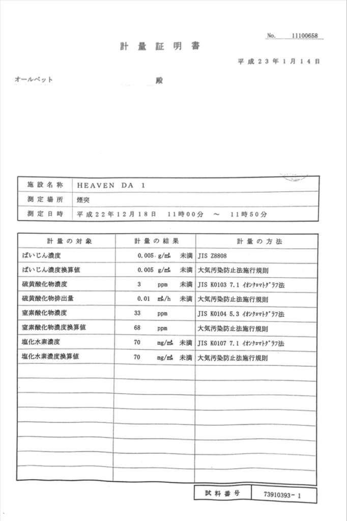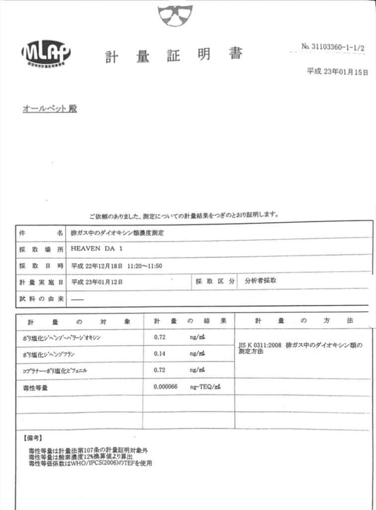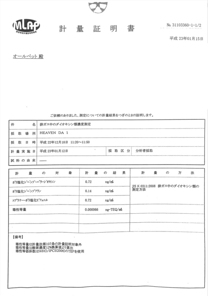 また火葬装置に関するダイオキシン、窒素酸化物、いおう酸化物などの耐汚染物質の測定については財団法人日本文化用品安全試験所等で行っております。 その結果、発生数値が極めて低い測定結果が出ております。